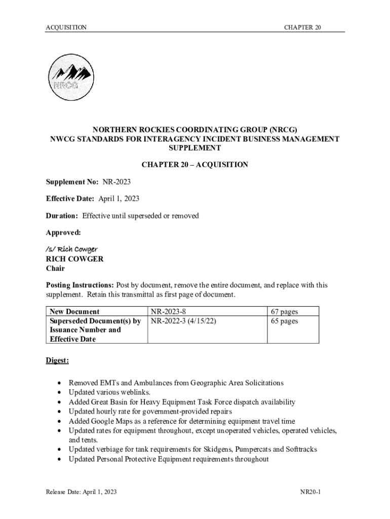 ACQUISITIONCHAPTER 20NORTHERN ROCKIES COORDINATING GROUP (NRC) WCG STANDARDS FOR INTERAGENCY INCIDENT BUSINESS MANAGEMENT SUPPLEMENT CHAPTER 20 ACQUISITION Supplement No: NR2023 Effective Date: April
