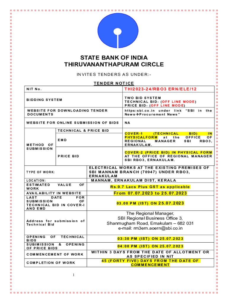 Get the free Tenders for electrical works at Mannam branch (1).doc