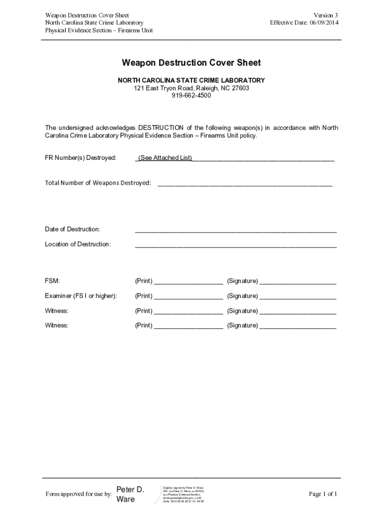 Weapon Destruction Cover Sheet North Carolina State Crime Laboratory Physical Evidence Section Firearms University 3 Effective Date: 06/09/2014Weapon Destruction Cover Sheet NORTH CAROLINA STATE CRIME