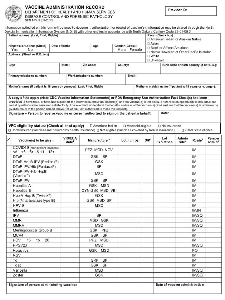 VACCINE ADMINISTRATION RECORDProvider ID:DEPARTMENT OF HEALTH AND HUMAN SERVICES DISEASE CONTROL AND FORENSIC PATHOLOGY SON 18385 (052023)Information collected on this form will be used to document