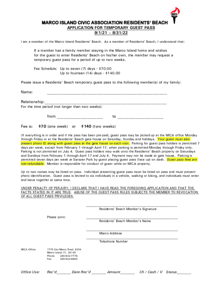 MA R C O IS LA N D C IV IC A S S O C IA T IO N R E S ID E N T S B E A C H APPLICATION FOR TEMPORARY GUEST PASS 9/1/21 8/31/22I am a member of the Marco Island Residents Beach. As a member of Residents
