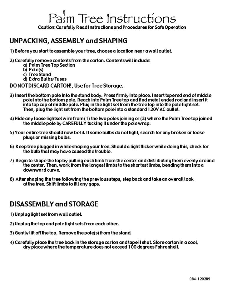 Palm Tree InstructionsCaution: Carefully Read Instructions and Procedures for Safe OperationUNPACKING, ASSEMBLY and SHAPING 1) Before you start to assemble your tree, choose a location near a wall