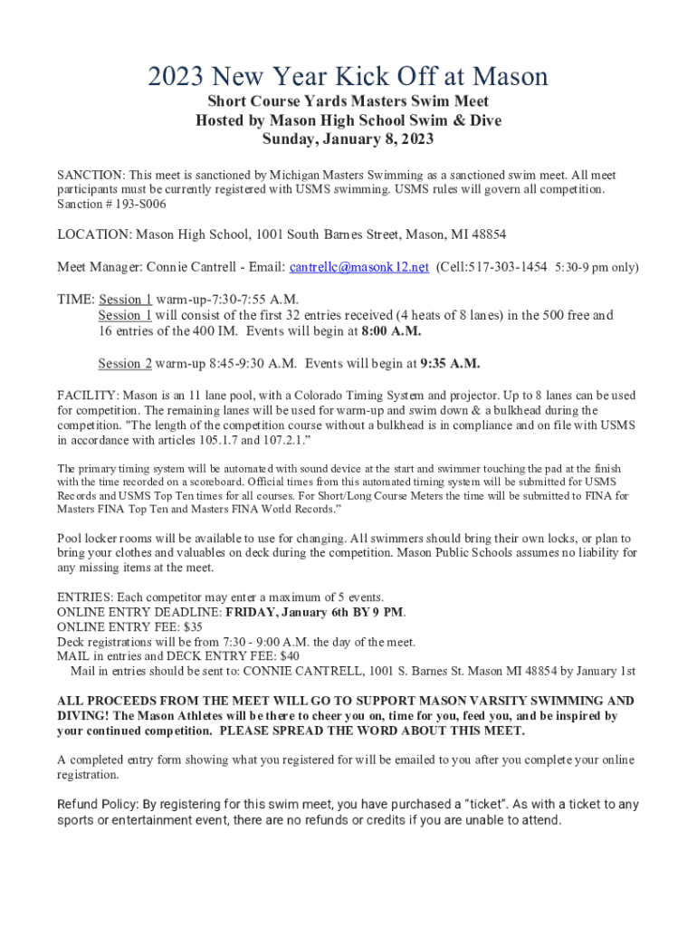 2023 New Year Kick Off at Mason Short Course Yards Masters Swim Meet Hosted by Mason High School Swim & Dive Sunday, January 8, 2023, SANCTION: This meet is sanctioned by Michigan Masters Swimming