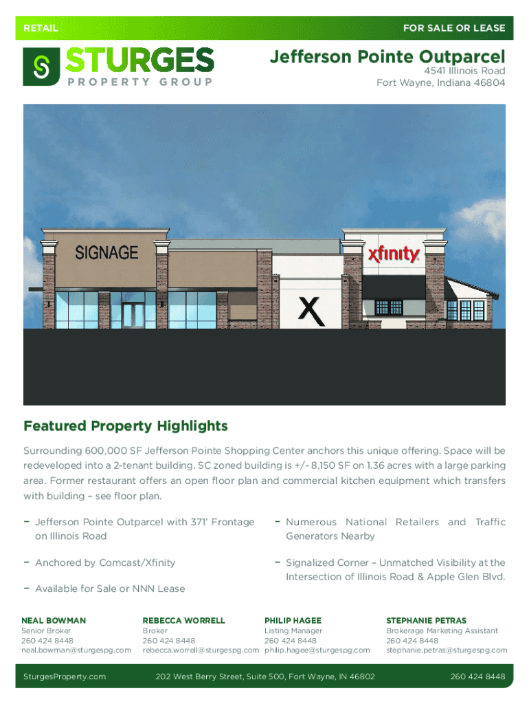 RETAILER SALE OR LEASE Jefferson Point Outparcel4541 Illinois Road Fort Wayne, Indiana 46804Featured Property Highlights Surrounding 600,000 SF Jefferson Point Shopping Center anchors this unique