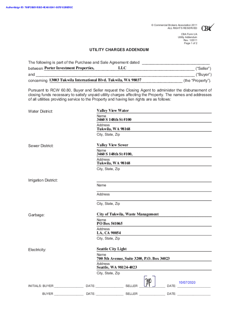 Authenticity ID: 790F288DB2654EA899A19078103B6D0C Commercial Brokers Association 2011 ALL RIGHTS RESERVED CBA Form UA Utility Addendum Rev. 1/2011-Page 1 of 2UTILITY CHARGES ADDENDUM The following