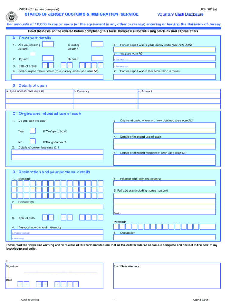 PROTECT (when complete)JCE 361(a)STATES OF JERSEY CUSTOMS & IMMIGRATION SERVICEVoluntary Cash Disclosure amounts of 10,000 Euros or more (or the equivalent in any other currency) entering or leaving