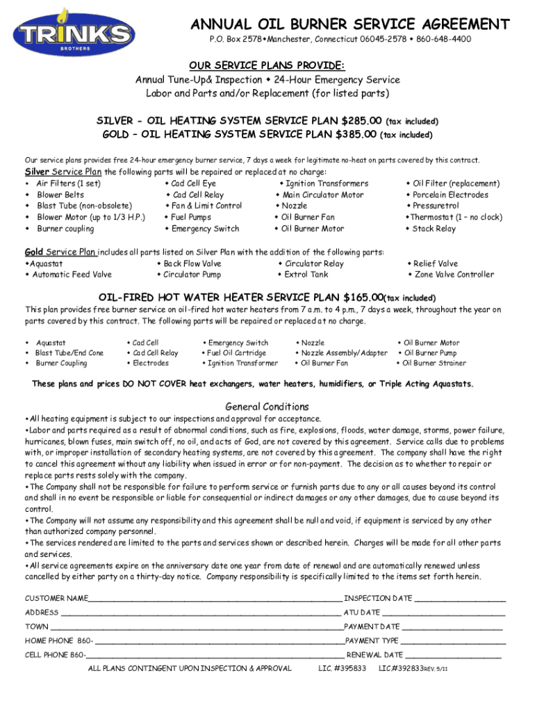 ANNUAL OIL BURNER SERVICE AGREEMENT P.O. Box 2578Manchester, Connecticut 060452578 8606484400OUR SERVICE PLANS PROVIDE: Annual Tuneup Inspection 24Hour Emergency Service Labor and Parts and/or Replacement