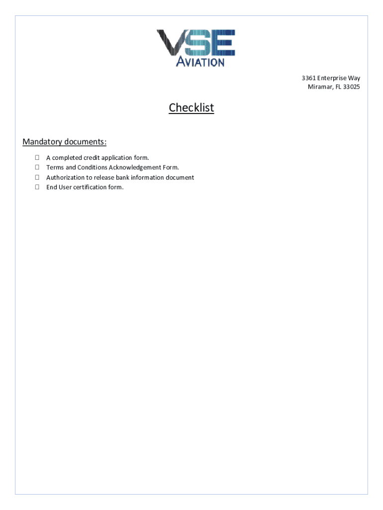 3361 Enterprise Way Miramar, FL 33025Checklist Mandatory documents: A completed credit application form. Terms and Conditions Acknowledgement Form. Authorization to release bank information document