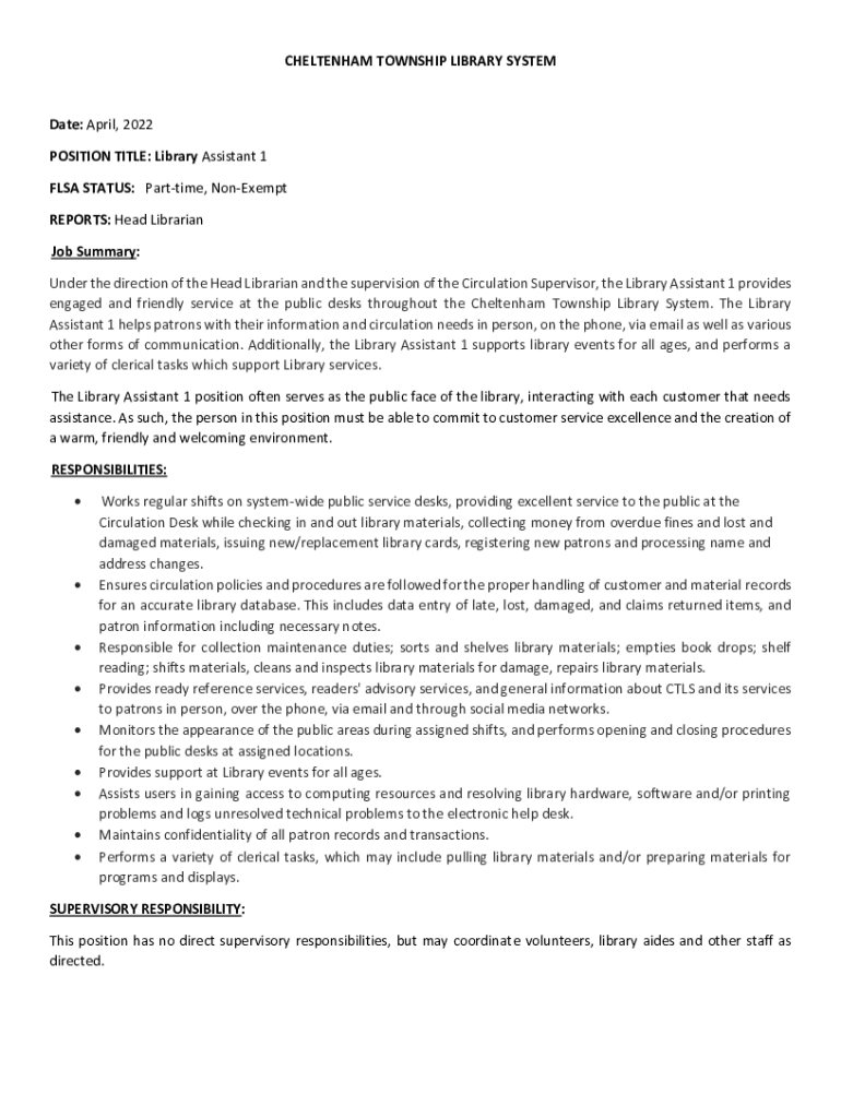 CHELTENHAM TOWNSHIP LIBRARY Systematic: April 2022 POSITION TITLE: Library Assistant 1 FLEA STATUS: Part time, Nonexempt REPORTS: Head Librarian Job Summary: Under the direction of the Head Librarian