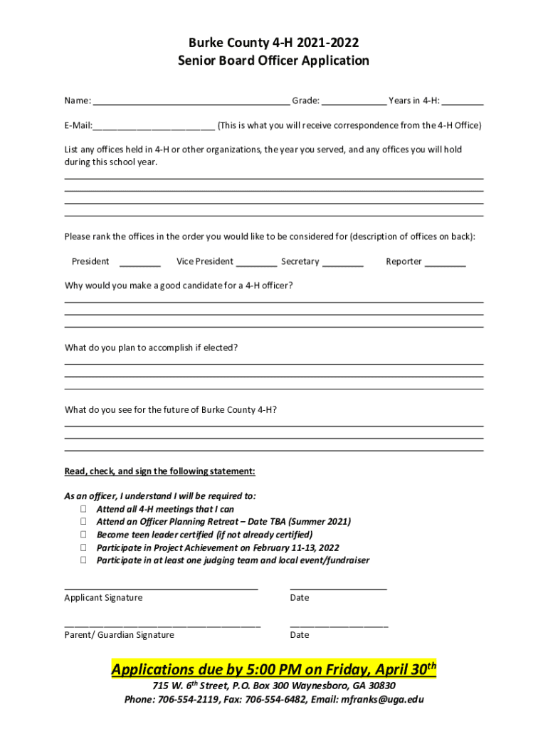 Burke County 4H 20212022 Senior Board Officer Application Name:Grade:Years in 4H:Email:___ (This is what you will receive correspondence from the 4H Office) List any offices held in 4H or other organizations,