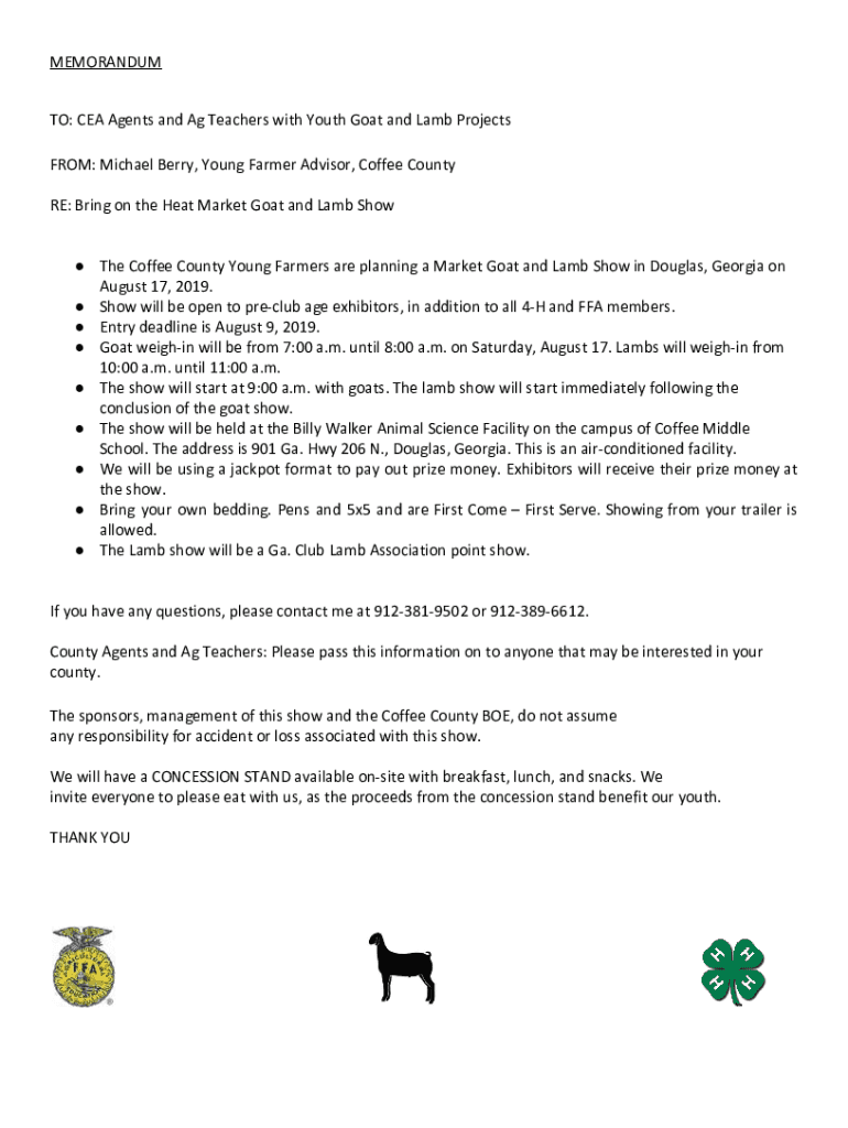 MEMORANDUM TO: CEA Agents and Ag Teachers with Youth Goat and Lamb Projects FROM: Michael Berry, Young Farmer Advisor, Coffee County RE: Bring on the Heat Market Goat and Lamb Show The Coffee County