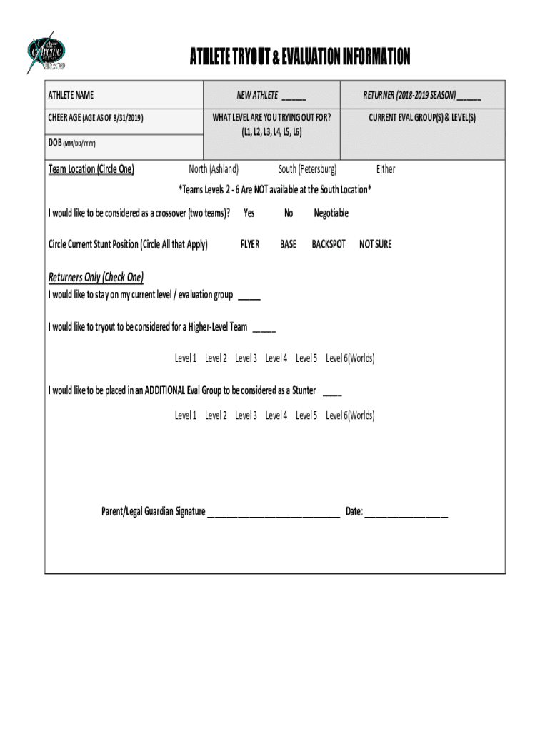 ATHLETE TRYOUT & EVALUATION INFORMATION ATHLETE NAME CHEER AGE (AGE AS OF 8/31/2019) DOB (MM/DD/YYY)Team Location (Circle One)NEW ATHLETE ___RETURNER (20182019 Seasons) ___WHAT LEVEL ARE YOU TRYING