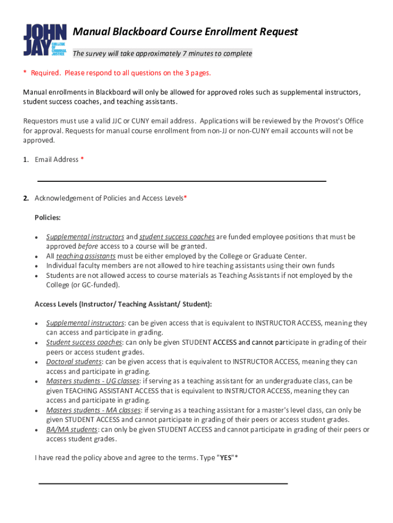 Manual Blackboard Course Enrollment Request The survey will take approximately 7 minutes to complete * Required. Please respond to all questions on the 3 pages. Manual enrollments in Blackboard will