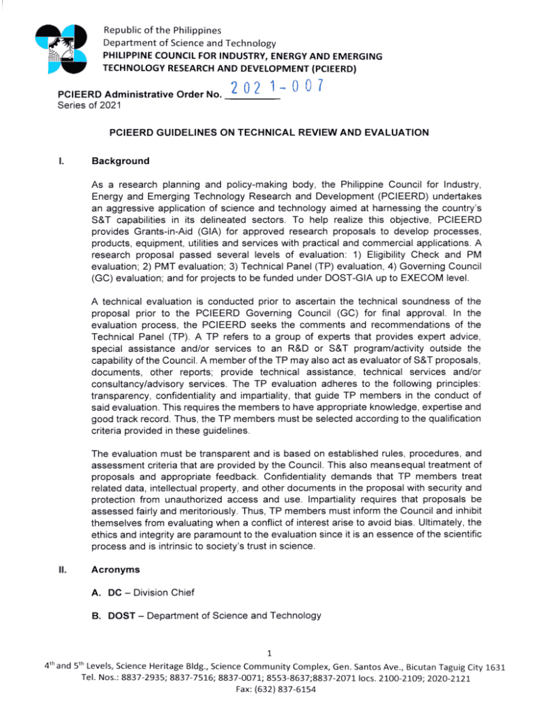 Republic of the Philippines Department of Science and Technology PHILIPPINE COUNCIL FOR INDUSTRY, ENERGY AND EMERGING TECHNOLOGY RESEARCH AND DEVELOPMENT (PCIE ERD) PCIE ERD Administrative Order No.