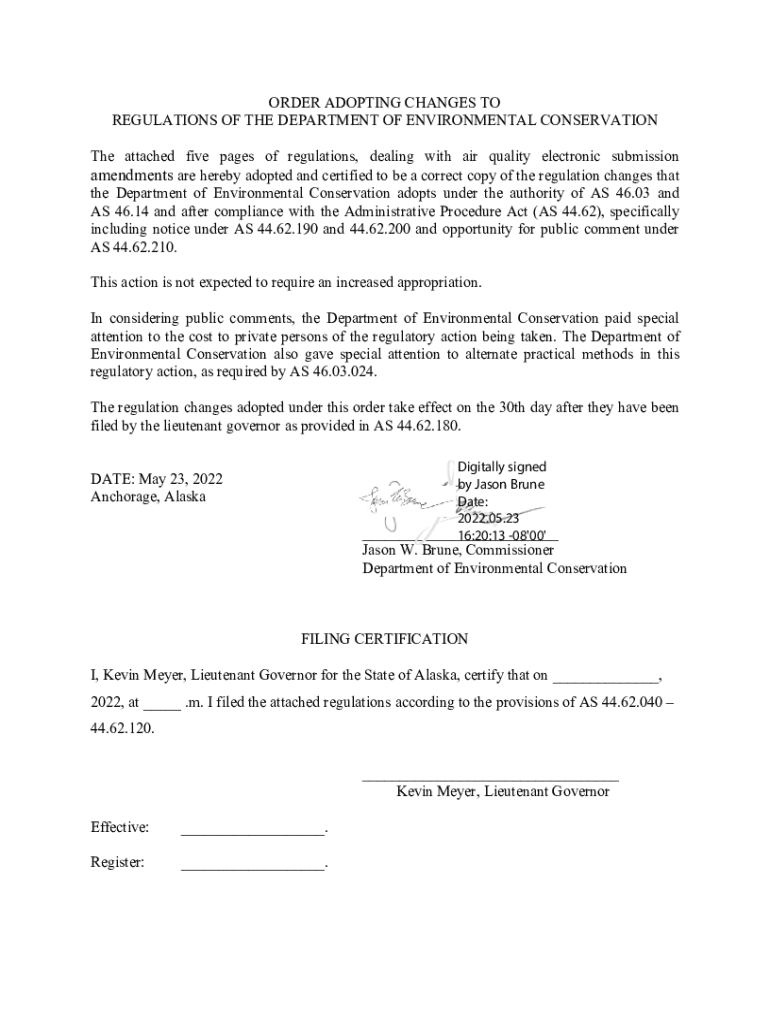 ORDER ADOPTING CHANGES TO REGULATIONS OF THE DEPARTMENT OF ENVIRONMENTAL CONSERVATION The attached five pages of regulations, dealing with air quality electronic submission amendments are hereby adopted