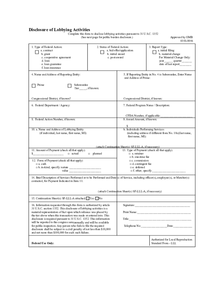 Disclosure of Lobbying ActivitiesComplete this form to disclose lobbying activities pursuant to 31 U.S.C. 1352 (See next page for public burden disclosure.)1. Type of Federal Action: a. contract b.