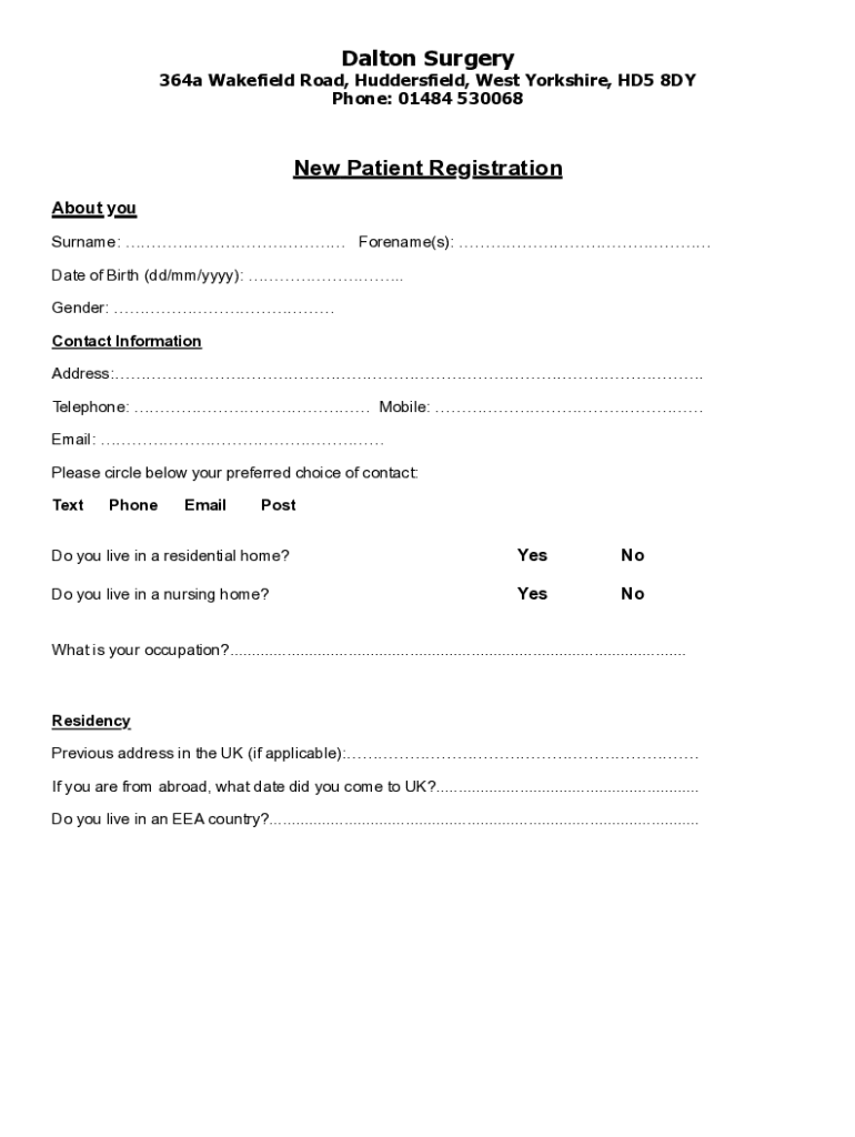 Dalton Surgery364a Wakefield Road, Huddersfield, West Yorkshire, HD5 8DY Phone: 01484 530068New Patient Registration About you Surname: Forename(s): Date of Birth (dd/mm/YYY): ... Gender: Contact