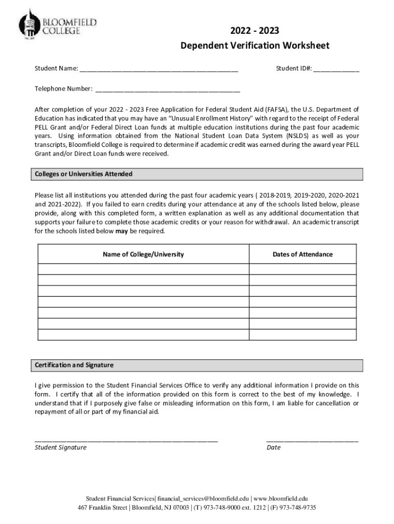 2022 2023 Dependent Verification Worksheet Student Name: ___Student ID#: ___Telephone Number: ___ After completion of your 2022 2023 Free Application for Federal Student Aid (FAFSA), the U.S. Department