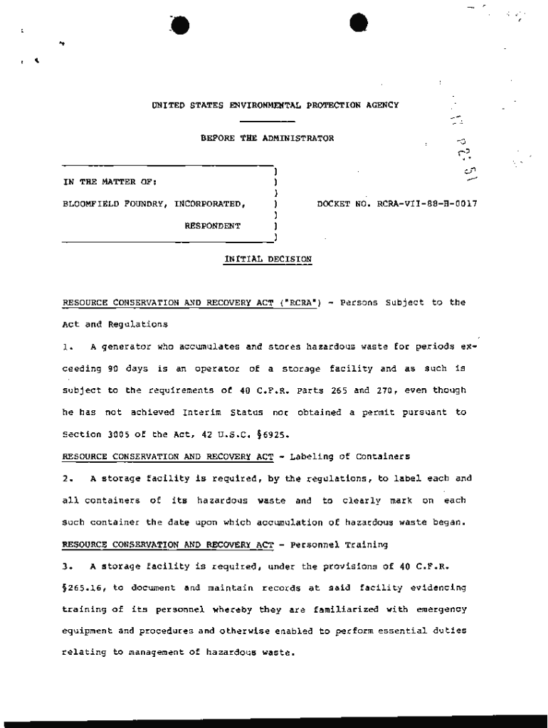 .,UNITED STATES ENVIRONMENTAL PROTECTION AGENCY.BEFORE THE ADMINISTRATOR))))))IN THE MATTER OF: BLOOMFIELD FOUNDRY, INCORPORATED, DOCKET NO. RCRAVII88H0017RESPONDENT ___) INITIAL DECISIONRESOURCE