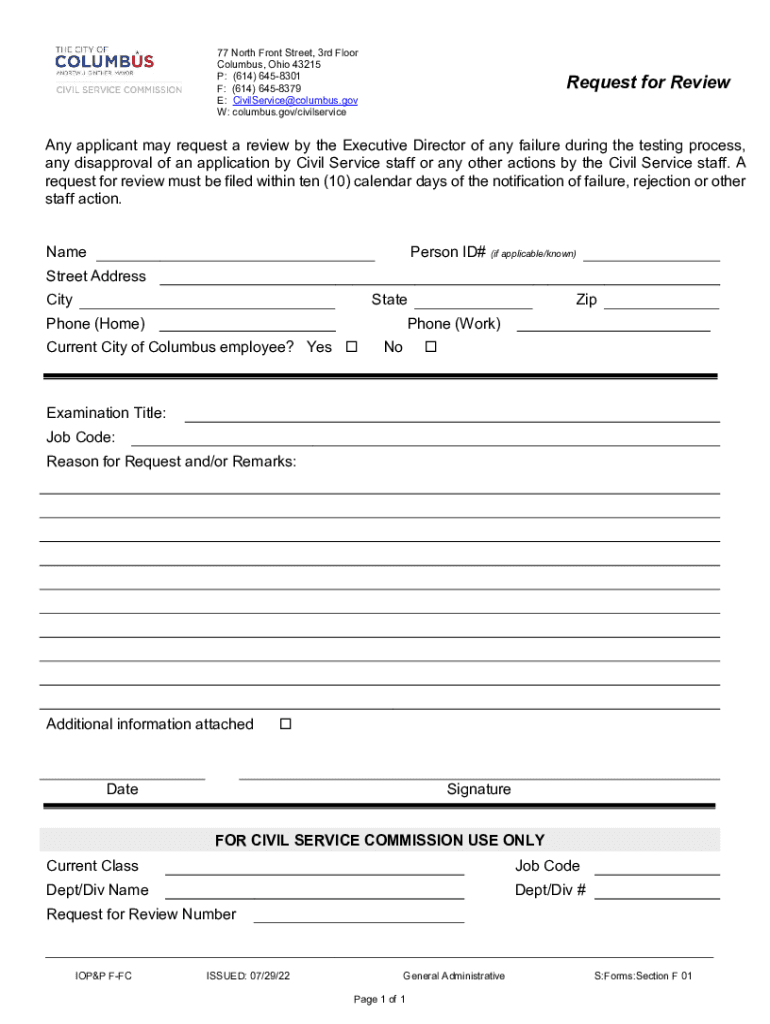 77 North Front Street, 3rd Floor Columbus, Ohio 43215 P: (614) 6458301 F: (614) 6458379 E: CivilService@columbus.gov W: columbus.gov/civilserviceRequest for Reviewing applicant may request a review