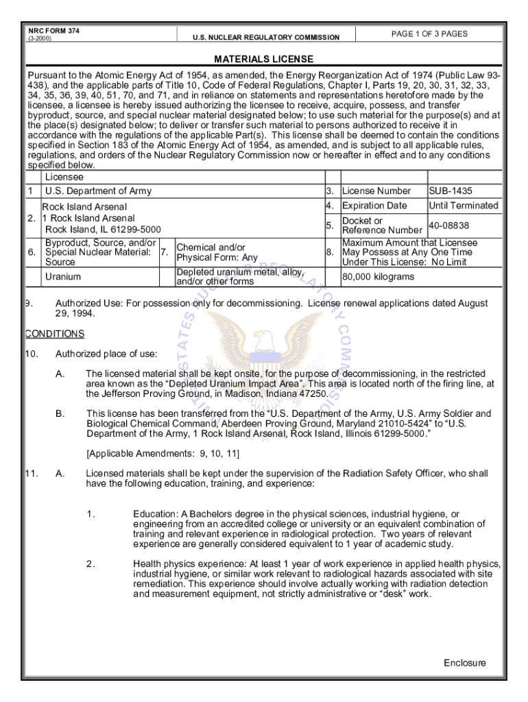NRC FORM 374U. S. NUCLEAR REGULATORY COMMISSION(32000)PAGE 1 OF 3 PAGESMATERIALS LICENSE Pursuant to the Atomic Energy Act of 1954, as amended, the Energy Reorganization Act of 1974 (Public Law 93438),