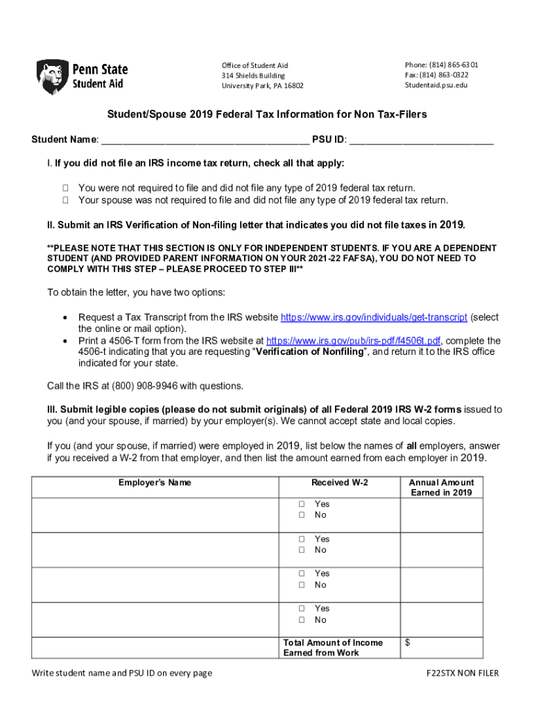 Phone: (814) 8656301 Fax: (814) 8630322 Student aid.PSU.office of Student Aid 314 Shields Building University Park, PA 16802Student/Spouse 2019 Federal Tax Information for Non Textiles Student Name: