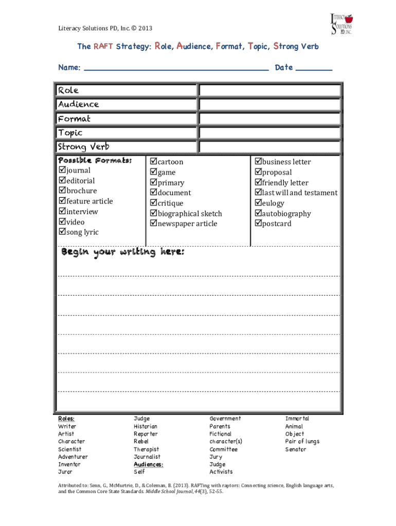 LiteracySolutionsPD, Inc.2013The RAFT Strategy: Role, Audience, Format, Topic, Strong Verb