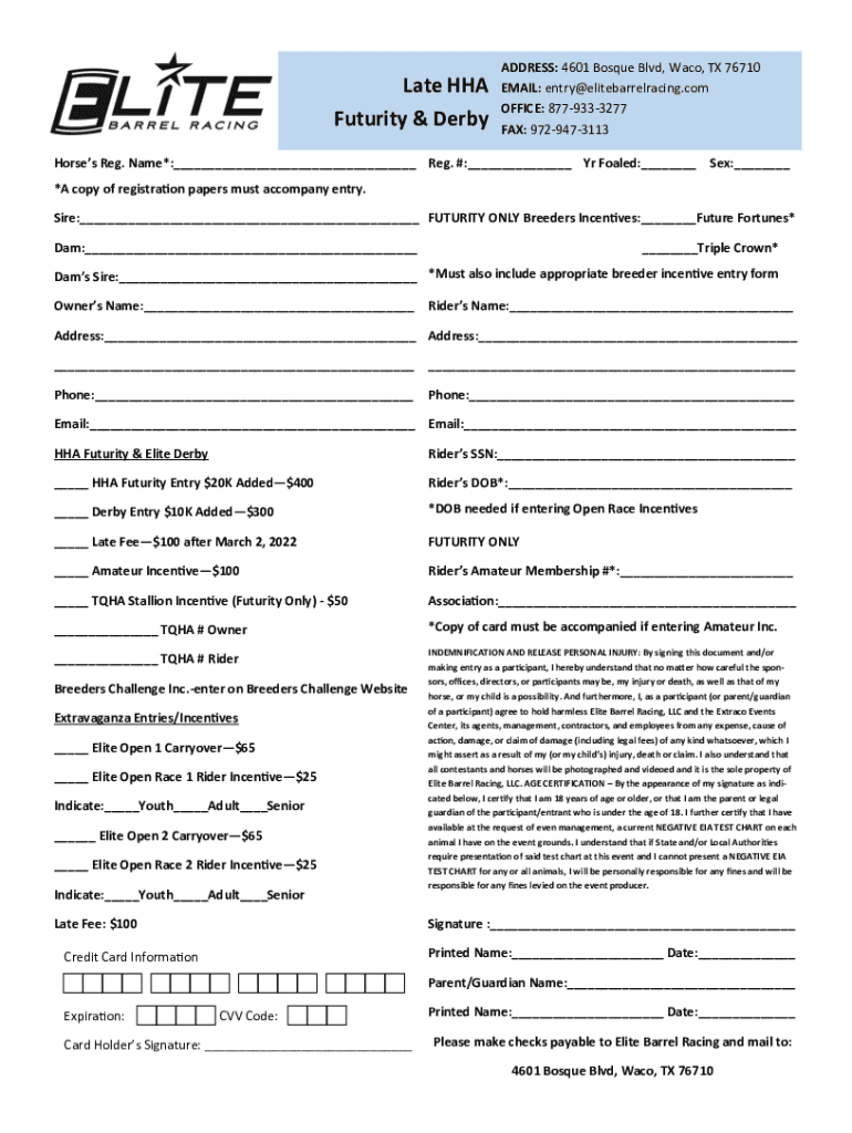 Late HHA Futurity & DerbyADDRESS: 4601 Mosque Blvd, Waco, TX 76710 EMAIL: entry@elitebarrelracing.com OFFICE: 8779333277 FAX: 9729473113Horses Reg. Name*:___ Reg. #:___ Yr Foaled:___Sex:___*A copy