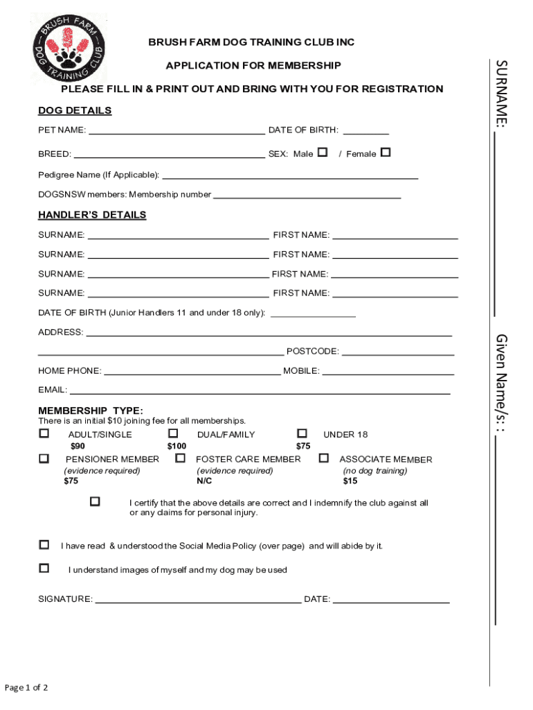 BRUSH FARM DOG TRAINING CLUB INCREASE FILL IN & PRINT OUT AND BRING WITH YOU FOR REGISTRATION DOG DETAILS PET NAME:DATE OF BIRTH:BREED:SEX: Male/// FemaleSURNAME:APPLICATION FOR MEMBERSHIPPedigree