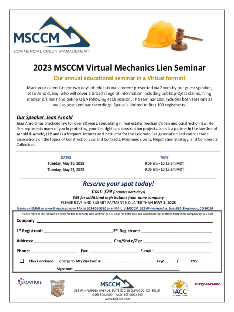 2023 MS CCM Virtual Mechanics Lien Seminar Our annual educational seminar in a Virtual format! Mark your calendars for two days of educational content presented via Zoom by our guest speaker, Jean