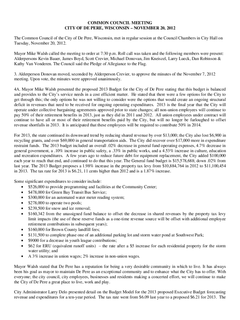 COMMON COUNCIL MEETING CITY OF DE Père, WISCONSIN NOVEMBER 20, 2012, The Common Council of the City of De Père, Wisconsin, met in regular session at the Council Chambers in City Hall on Tuesday,