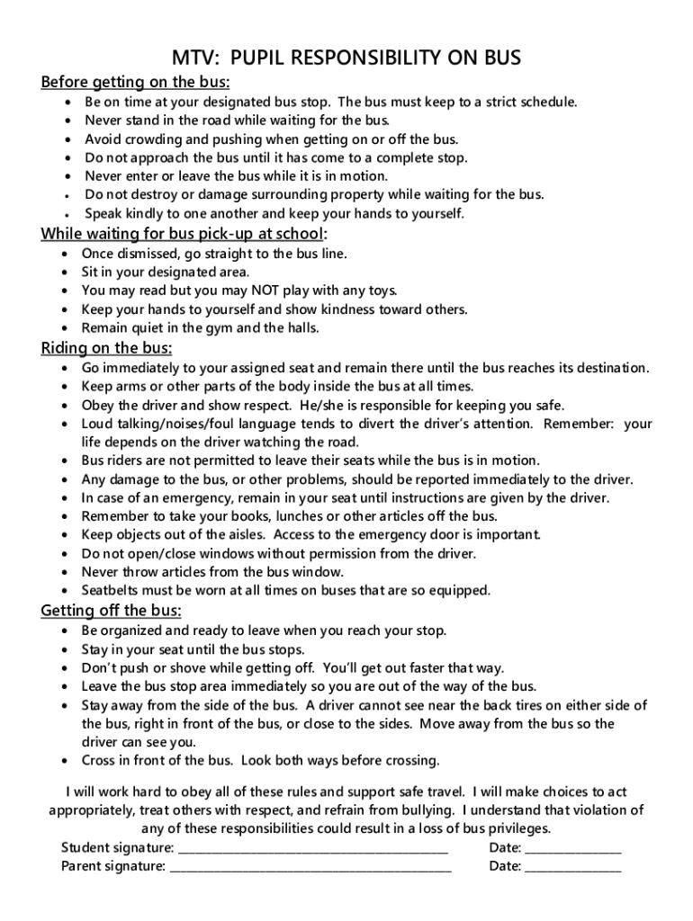 MTV: PUPIL RESPONSIBILITY ON BUS Before getting on the bus: Be on time at your designated bus stop. The bus must keep to a strict schedule. Never stand in the road while waiting for the bus. Avoid