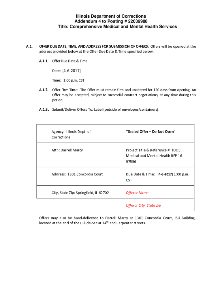 Illinois Department of Corrections Addendum 4 to Posting # 22039980 Title: Comprehensive Medical and Mental Health Services.1.OFFER DUE DATE, TIME, AND ADDRESS FOR SUBMISSION OF OFFERS: Offers will