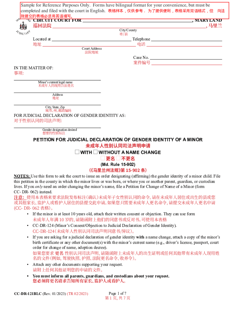 Sample for Reference Purposes Only. Forms have bilingual format for your convenience, but must be completed and filed with the court in English. CIRCUIT COURT FOR Located at City/County /, MARYLAND