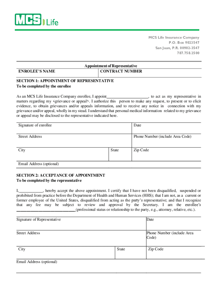 MCS Life Insurance Company P.O. Box 9023547 San Juan, P.R. 009023547 787.758.2500ENROLEES Reappointment of Representative CONTRACT NUMBERSECTION 1: APPOINTMENT OF REPRESENTATIVE To be completed by