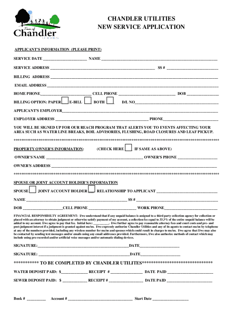 CHANDLER UTILITIES NEW SERVICE APPLICATIONAPPLICANT\'S INFORMATION (PLEASE PRINT) SERVICE DATE ___ NAME ___ SERVICE ADDRESS ___ SS # ___ BILLING ADDRESS ___ EMAIL ADDRESS ___ HOME PHONE___ CELL PHONE