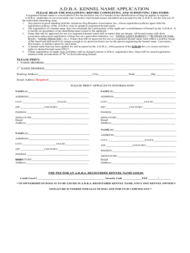 Fill out your adba registered kennels form online with pdfFiller!