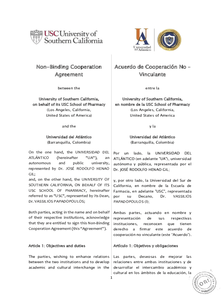 Nonbinding CooperationAcuerdo de Cooperacin No AgreementVinculantebetween there University of Southern California, University of Southern California, on behalf of its USC School of Pharmacyen hombre