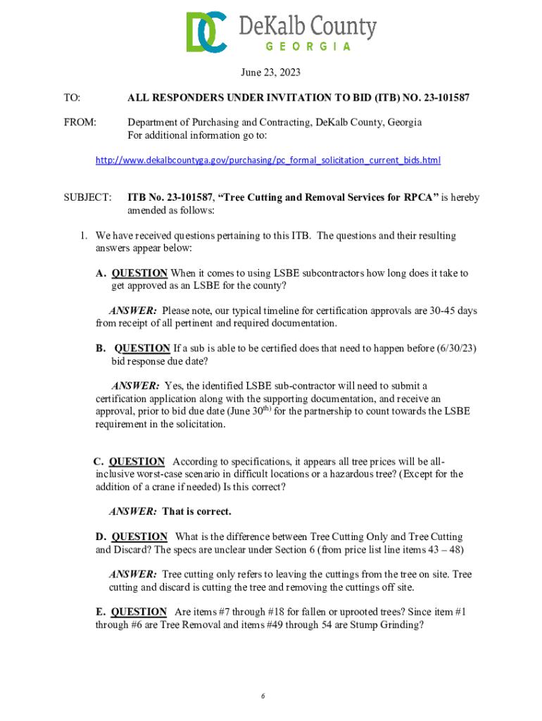 June 23, 2023, TO:ALL RESPONDERS UNDER INVITATION TO BID (ITB) NO. 23101587FROM:Department of Purchasing and Contracting, DeKalb County, Georgia For additional information go to:http://www.dekalbcountyga.gov/purchasing/pc_formal_solicitation_current_bids.htmlSUBJECT:ITB