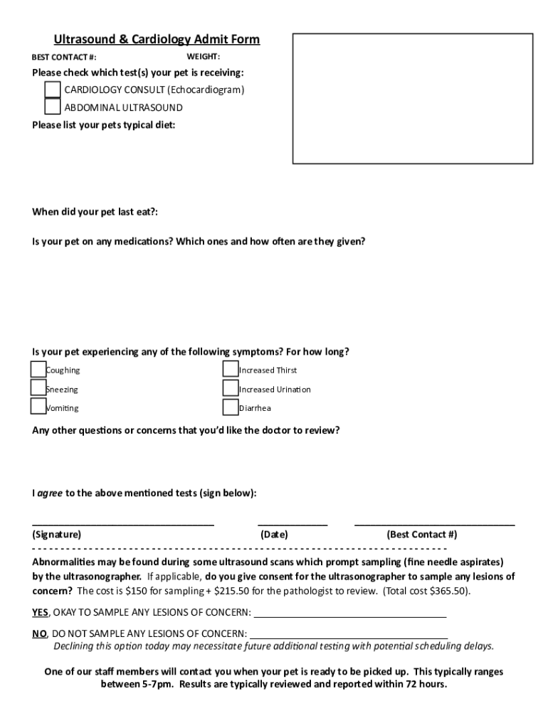 Ultrasound & Cardiology Admit Form BEST CONTACT #:WEIGHT:When did your pet last eat?:Is your pet on any medications? Which ones and how often are they given? Is your pet experiencing any of the following