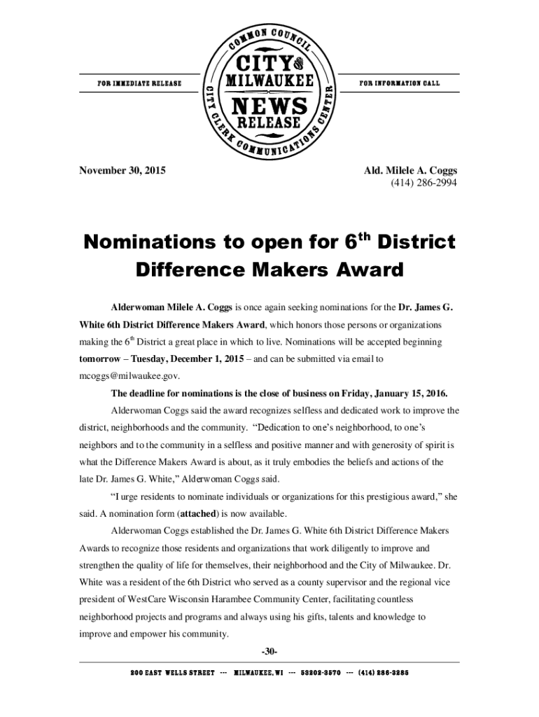 November 30, 2015Ald. Middle A. Cogs (414) 2862994Nominations to open for 6th District Difference Makers Award Alderwoman Middle A. Cogs is once again seeking nominations for the Dr. James G. White