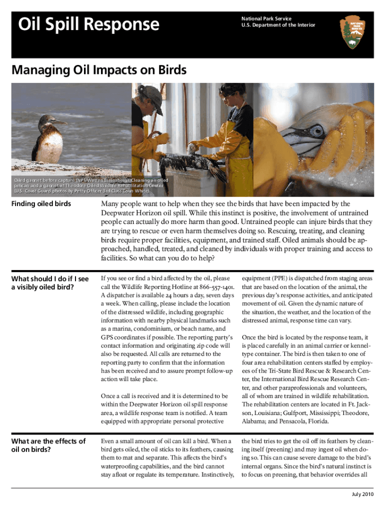 Oil Spill ResponseNational Park Service U.S. Department of the InteriorManaging Oil Impacts on Broiled gannet before capture (NPS/Warren Heisenberg). Cleaning an oiled pelican and a gannet at Theodore