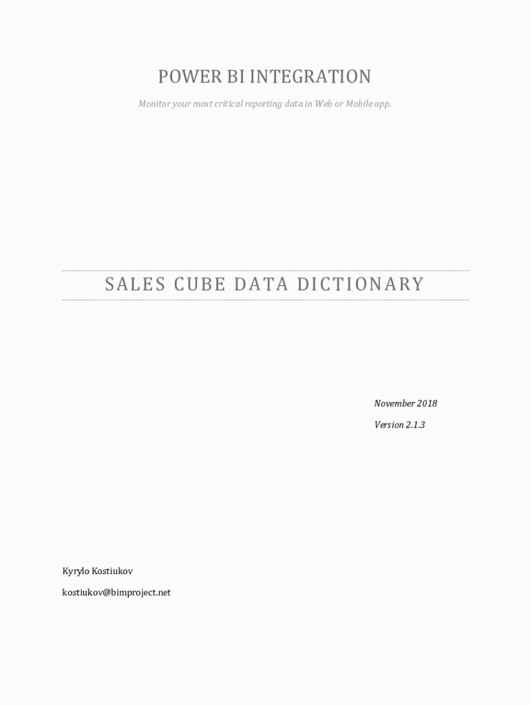 POWER BI INTEGRATION Monitor your most critical reporting data in Web or Mobile app. SALES CUBE DATA DICTIONARY November 2018 Version 2.1.3Kyrylo Kosciusko kostiukov@bimproject.netC O P Y R I G H