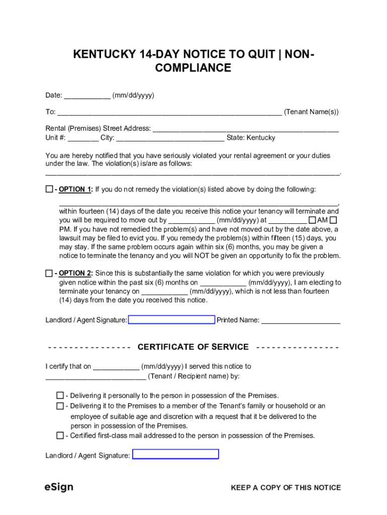 KENTUCKY 14DAY NOTICE TO QUIT | NONCOMPLIANCE Date: ___ (mm/dd/YYY) To: ___ (Tenant Name(s)) Rental (Premises) Street Address: ___ Unit #: ___ City: ___ State: Kentucky You are hereby notified that