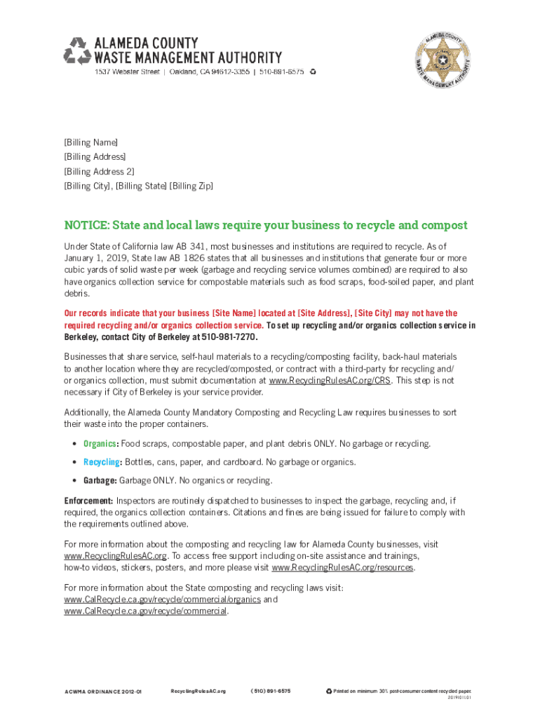 [Billing Name] [Billing Address] [Billing Address 2] [Billing City], [Billing State] [Billing Zip]NOTICE: State and local laws require your business to recycle and compost Under State of California