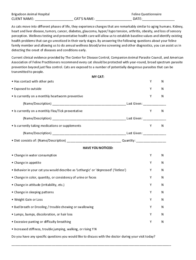 Brigadoon Animal HospitalFeline QuestionnaireCLIENT NAME: ___ CATS NAME: ___ DATE:___ As cats move into different phases of life, they experience changes that are remarkably similar to aging humans.