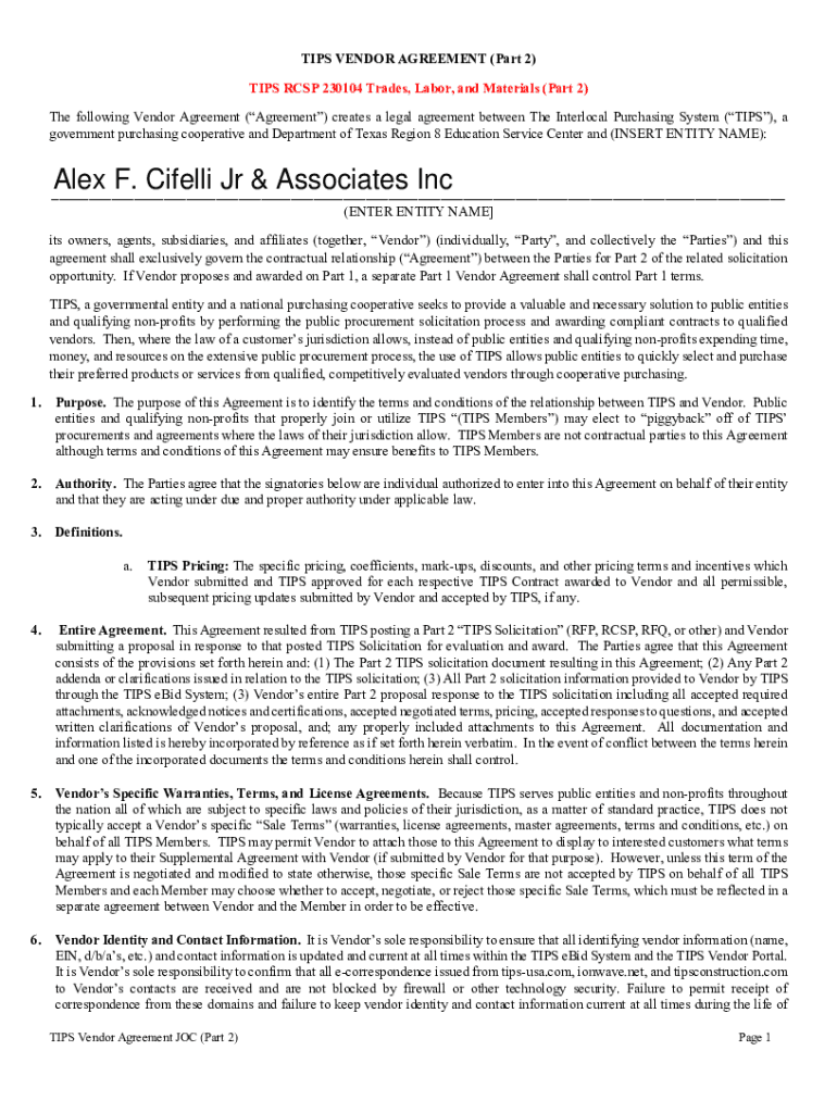 TIPS VENDOR AGREEMENT (Part 2) TIPS RCMP 230104 Trades, Labor, and Materials (Part 2) The following Vendor Agreement (Agreement) creates a legal agreement between The Interlocal Purchasing System