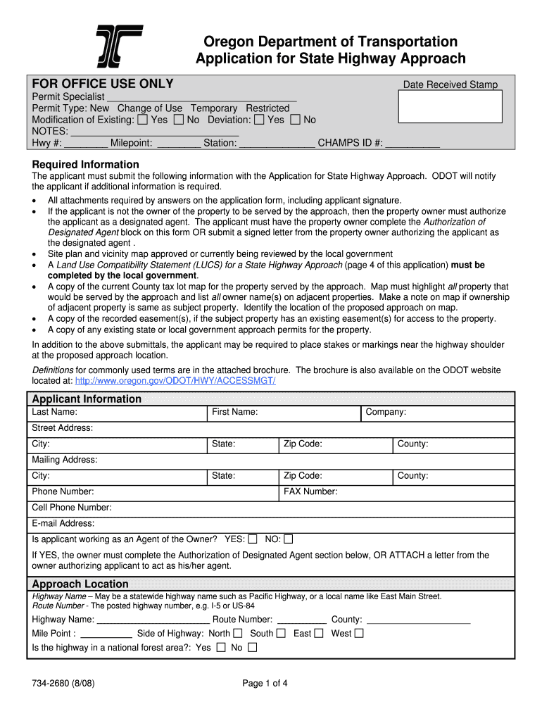 Oregon Department of Transportation Application for State Highway Approach FOR OFFICE USE ONLY Date Received Stamp Permit Specialist Permit Type New Change of Use Temporary Restricted Modification of Existing Yes No Deviation No NOTES Hwy Milepoint Station CHAMPS ID Required Information The applicant must submit the following information with the Application for State Highway Approach. ODOT will notify the applicant if additional information is...