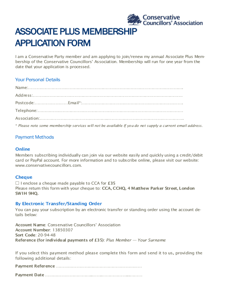 ASSOCIATE PLUS MEMBERSHIP APPLICATION FORM I am a Conservative Party member and am I applying to join/renew my annual Associate Plus Membership of the Conservative Councillors Association. Membership