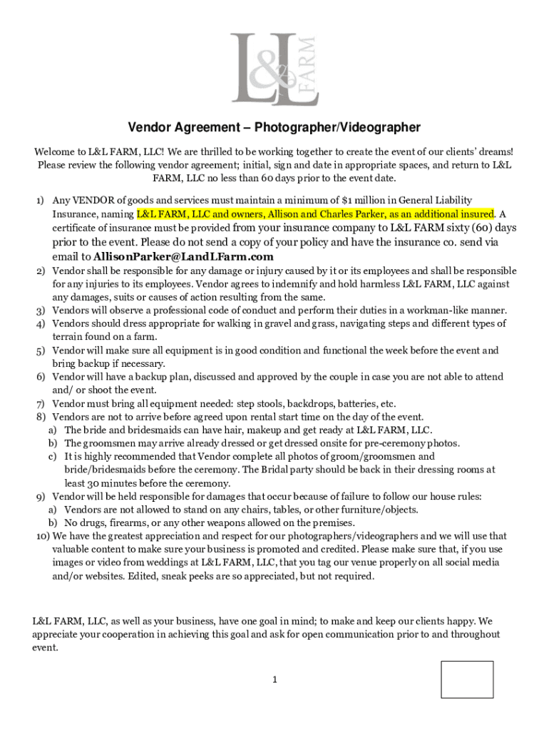 Vendor Agreement Photographer/Videographer Welcome to L&L FARM, LLC! We are thrilled to be working together to create the event of our clients dreams! Please review the following vendor agreement;